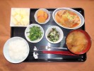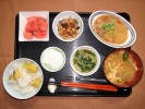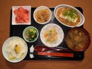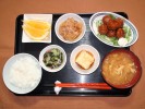 ごはん、味噌汁(玉ネギ、たまご)、ミートボールの中華甘酢あん(水菜、マヨネーズ)、竹の子土佐煮(おかか、あげ)、揚げ出し豆腐、酢の物(キュウリ・ワカメ・カニカマ)、フルーツ:愛媛産宇和ゴールド |
