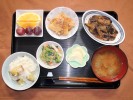 ごはん、味噌汁(白菜、なめこ)、とりもも肉と大根の治部煮(大根葉)、さつま芋甘煮、のうらぼうマヨネーズ和え、キュウリ・ワカメ・カニカマの酢の物、フルーツ:リンゴ |