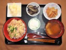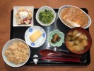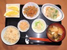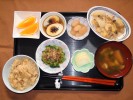 竹の子ごはん(とり肉、あげ)、味噌汁(おふ、ワカメ、長ネギ)、ソフト揚げ和風ソースがけ(大根おろし、刻みオクラ、なめ茸)、金平ごぼう(白すり胡麻)、白花いんげん豆煮、白菜のおひたし中華風(白すり胡麻)、フルーツ:愛媛産宇和ゴールド |