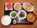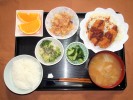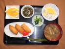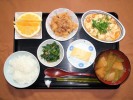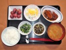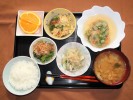 ごはん、味噌汁(白菜、椎茸、あげ)、豆腐ハンバーグ和風ソースがけ(大根おろし、刻みオクラ、なめ茸)、仙台ふの玉子とじ(三つ葉)、もやし・キュウリ・竹輪の酢の物(白すり胡麻)、菜花のおひたし(おかか)、フルーツ:カシュ―オレンジ |
