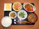 ごはん、味噌汁(レタス、なめこ)、麻婆茄子(豚の挽肉)、大根とシーチキン煮、さつま芋甘煮、厚焼きたまご、フルーツ:スイカ |