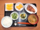 ごはん、味噌汁(白菜、なめこ)、ぶりの照り焼き、じゃがいもの粉ふき煮(インカのめざめ)、のらぼうのマヨネーズ和え、キュウリの中華炒め、フルーツ:カシュ―オレンジ |