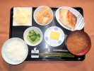 ごはん、味噌汁(大根、しめじ)、ほっけの塩焼き、たけの子とがんもの含め煮、菜花の辛子和え、厚焼き玉子、フルーツ:リンゴ |