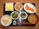竹の子ごはん(とり肉、あげ)、味噌汁(白菜、なめこ)、チリ産の鮭の塩焼き、切り干し大根煮(人参、あげ、竹輪、さつま揚げ、大根葉)、ほうれん草なめ茸和え、もずく酢(キュウリ)、フルーツ:台湾産の生のパイナップル |