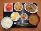 ごはん、味噌汁(白菜、なめこ)、豚肉しょうが焼き(玉ネギ)、竹の子の土佐煮(あげ、おかか)、茄子の胡麻味噌田楽、ほうれん草ちりめんじゃこ和え、フルーツ:スイカ |