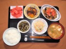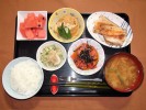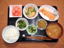 ごはん、味噌汁(白菜、なめこ)、チリ産の鮭の塩焼き、仙台ふのたまごとじ(三つ葉)、ほうれん草・なめ茸和え、青梅の甘露煮、キュウリとみょうがの梅しそ漬け、フルーツ:大玉スイカああ |