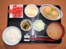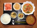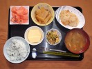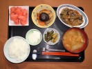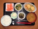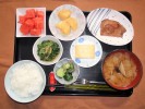 ごはん、味噌汁(大根、松山あげ)、肉じゃが(豚肉、しらたき、玉ネギ、グリーンピース、ジャガイモ)、玉子豆腐、キュウリ中華炒め、大根柚子漬け、フルーツ:大玉スイカ |