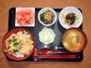 親子丼(とり肉、玉ネギ、なると、玉子、三つ葉)、味噌汁(豆腐、あげ、長ネギ)、大根胡麻味噌田楽(大根葉)、ほうれん草のおひたし(おかか)、大根の柚子漬け、フルーツ:大玉スイカ |