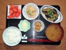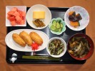 ごはん、味噌汁(豆腐、あげ、長ネギ)、豚肉と茄子の味噌炒め(刻みトマト)、かぼちゃいと子煮、キャベツ・人参・三つ葉のおひたし(白すり胡麻)、もずく酢(キュウリ)、フルーツ:大玉スイカ |