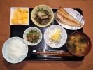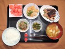 ごはん、味噌汁(豆腐、あげ、長ネギ)、ぶりの照り焼き(大葉)、がんも含め煮(いんげん)、ほうれん草のおひたし(おかか)、キュウリの中華炒め、フルーツ:大玉のスイカ |