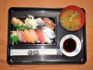 いなり寿司(紅しょうが)、清汁(茄子、たまご、みょうが)、もずく酢(キュウリ)、かぼちゃいと子煮、厚焼きたまご、ふき煮、キュウリとみょうがの梅しそ漬け、フルーツ:大玉スイカ |
