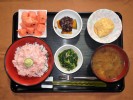 まぐろ丼(刻み海苔、キュウリわさび乗せ)、味噌汁(茄子、あげ、みょうが)、かぼちゃいと子煮、揚げ出し豆腐、ほうれん草なめ茸和え、フルーツ:大玉スイカ |