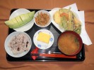 お赤飯(ごま塩)、味噌汁(豆腐、なめこ、三つ葉)、天ぷら盛り合わせ(天つゆ、さつま芋、かぼちゃ、茄子、オクラ、ピーマン、パプリカ赤、竹輪いそべ)、金平ごぼう(白すり胡麻)、厚焼きたまご、フルーツ:メロン |