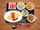 チキンオムライス(特製デミグラスソース)、いろいろきの子のコンソメスープ、ブロッコリーの胡麻ドレ和え、酢の物(もやし・キュウリ・竹輪)、破竹のおかか煮(あげ)、フルーツ:大玉のスイカ |