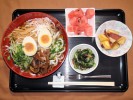 冷やしうどん(細うどん、キュウリ、煮椎茸、根あげ、揚げ玉、煮たまご、カニカマ、みょうが、万能ネギ、カイワレ)、大学芋、酢の物(キュウリ、ワカメ、カニカマ)、フルーツ:大玉スイカ |