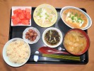 五目炊き込みごはん、味噌汁(白菜、あげ、椎茸、万能ネギ)、豆腐挽肉あんかけ(万能ネギ)、とうがんカニカマあんかけ、もずく酢(キュウリ)、うずら豆煮、フルーツ:大玉スイカ |