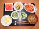 ごはん、味噌汁(白菜、椎茸)、まぐろ生姜焼き、じゃがいもの粉ふき煮、ほうれん草なめ茸和え、厚焼きたまご、キュウリ・みょうがの梅しそ漬け、フルーツ:大玉スイカ |