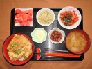 かつ丼(豚ロースかつ、玉ネギ、たまご、グリーンピース)、味噌汁(白菜、なめこ)、酢の物(もやし、キュウリ、竹輪、白すり胡麻)、うずら豆煮、大根の柚子漬け、トマトわさび醤油和え(刻み海苔)、フルーツ:大玉スイカ |