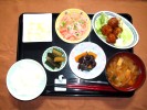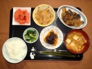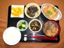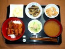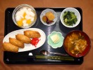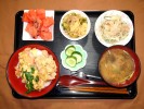 さつま芋ごはん、味噌汁(白菜、松山あげ)、豆腐と挽肉のあんかけ(万能ネギ)、レンコンの金平(白すり胡麻)、もずく酢(キュウリ)、大根の柚子漬け、フルーツ:バナナ(ブルーベリーソースがけ) |