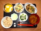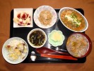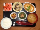 ごはん、味噌汁(白菜、椎茸)、豆腐挽肉あんかけ(万能ネギ)、茄子・ポン酢炒め(白すり胡麻)、モロヘイヤのおひたし(おかか)、さつま芋の甘煮、フルーツ:大玉スイカ |