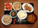 鶏ごぼう御飯、味噌汁(とうがん、あげ)、とりのから揚げ、がんも含め煮、モロヘイヤのおひたし(おかか)、たまご豆腐、フルーツ:大玉スイカ |