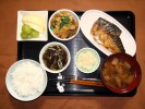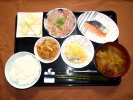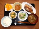 ごはん、味噌汁(白菜、なめこ)、チリ産の鮭の塩焼き、切り干し大根煮(人参、あげ、竹輪、さつま揚げ)、とうがんのあんかけ(カニカマ、グリーンピース)、ポテトサラダ(人参、キュウリ、ロースハム、ゆでたまご)、フルーツ:きおう(黄王)リンゴ |