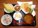 お赤飯(ごま塩)、味噌汁(豆腐、なめこ、三つ葉)、天ぷら盛り合わせ(天つゆ、さつま芋、かぼちゃ、茄子、オクラ、ピーマン、パプリカ赤、竹輪いそべ)、金平ごぼう(白すり胡麻)、厚焼きたまご、フルーツ:北海道らいでんメロン |