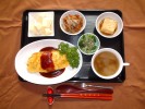 チキンオムライス(パセリ、特製ソース)、とうがんとキノコのコンソメスープ、ブロッコリーのごまドレがけ、金平ごぼう(白すり胡麻)揚げ出し豆腐、フルーツ:リンゴ |