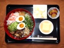 冷やしうどん(細うどん、キュウリ、カニカマ、煮あげ、煮しいたけ、揚げ玉、みょうが、万能ネギ、カイワレ、煮たまご、さつま芋の甘煮、たまご豆腐、フルーツ:リンゴ |