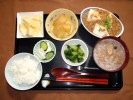 ごはん、味噌汁(茄子、松山あげ、みょうが)、麻婆豆腐(豚ひき肉、万能ネギ)、竹の子の土佐煮、もずく酢(キュウリ)、キュウリの中華炒め、フルーツ:杏仁豆腐(イチゴ、ゴールデンキウイ) |