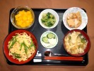 竹の子ごはん(とり肉)、うどん汁(地粉うどん、豚肉、椎茸、長ネギ、みょうが)、茄子の揚げびたし(三つ葉)、玉子豆腐、キュウリ梅しそ漬け、フルーツ:マンゴープリン(いちご) |