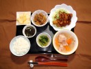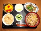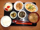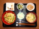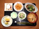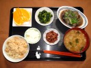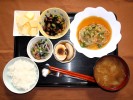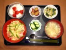 ごはん、味噌汁(白菜、なめこ)、豆腐ハンバーグ和風ソースがけ(大根おろし、なめ茸、オクラ)、ひじき煮(人参、あげ、大豆、むき枝豆)、酢の物(キュウリ、ワカメ、カニカマ)、煮たまご(黒ごま)、フルーツ:リンゴ |