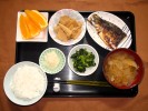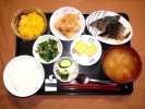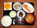 ごはん、味噌汁(玉ネギ、たまご)、チリ産の鮭の塩焼き、ほうれん草の白和え(人参、こんにゃく)、茄子のポン酢炒め、大根おろし甘酢しょうが和え、フルーツ:ネーブルオレンジ |