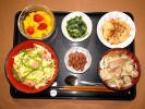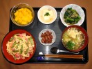 五目ちらし寿司(人参、あげ、椎茸、かんぴょう、きんし玉子、さくらでんぶ、絹さや)、うどん汁(地粉うどん、豚肉、椎茸、長ネギ、みょうが)、たけのこの土佐煮、ほうれん草・なめ茸和え、うずら豆煮、フルーツ:マンゴープリン(いちご) |