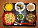 五目ちらし寿司(人参、あげ、椎茸、かんぴょう、桜でんぶ、きんし玉子、絹さや)、かき玉汁(長ネギ)、さつま芋の甘煮、小松菜とあげの炒め、キュウリの梅しそ漬け、フルーツ:杏仁豆腐(イチゴ) |