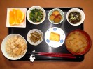 竹の子ごはん(とり肉)、味噌汁(白菜、しめじ、松山あげ、三つ葉)、茄子の揚げびたし(三つ葉)、菜の花の辛子和え、長芋の梅しそ漬け、うずらの豆煮、フルーツ:ネーブルオレンジ |