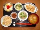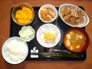 ごはん、味噌汁(白菜、しめじ、松山あげ)、豆腐の挽肉あんかけ(万能ネギ)、じゃがいもの粉ふき煮、菜花の辛子和え、かぶとキュウリの梅しそ漬け、フルーツ:リンゴ |
