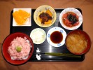 まぐろ丼(寿飯、刻み海苔、キュウリわさび乗せ)、味噌汁(白菜、椎茸、しめじ)、かぼちゃいとこ煮、トマトわさび醤油和え、長芋の梅しそ漬け、フルーツ:ネーブルオレンジ |