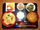 親子丼(とりもも肉、玉ネギ、なると、玉子、三つ葉)、味噌汁(白菜、しめじ)、れんこんの金平、大根の柚子漬け、フルーツ:はるか、いちご(クリーム添え) |