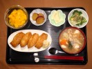 ごはん、野菜コンソメスープ(キャベツ、玉ネギ、人参、ベーコン)、アジフライ(千切りキャベツ、特製ソース)、竹の子の土佐煮(かつお節)、菜花の辛子和え、もずく酢(キュウリ)、フルーツ:リンゴ |