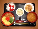 三色丼(とり挽肉、いりたまご、いんげん、刻み紅しょうが)、味噌汁(大根、しめじ)、竹の子の土佐煮、酢の物(もやし、キュウリ、竹輪)、フルーツ:杏仁豆腐(いちご) |