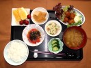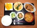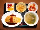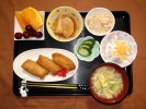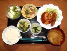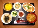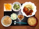 ごはん、味噌汁(白菜、たまねぎ)、豚かつとポテトコロッケ(千切りキャベツ、特製ソース)、仙台ふのたまごとじ(三つ葉)、ブロッコリー胡麻ドレがけ、キュウリとみょうがの梅しそ漬け、フルーツ:杏仁豆腐(キウイフルーツ) |
