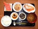 ごはん、味噌汁(茄子、あげ、みょうが)、チリ産鮭の塩焼き、竹の子土佐煮、煮たまご、もずく「酢(キュウリ)、フルーツ:熊本産のスイカ |