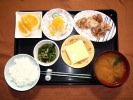 ごはん、味噌汁(豆腐、なめこ、三つ葉)、とりの唐揚げ、ポテトサラダ(人参、キュウリ、ロースハム、ゆでたまご)、ほうれん草なめ茸和え、たまご豆腐、フルーツ:愛媛産宇和ゴールド |