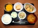 ごはん、味噌汁(たまご、長ネギ)、肉じゃが(豚肉、玉ネギ、しらたき、グリーンピース)、揚げ出し豆腐、酢の物(キュウリ、もやし、竹輪、白すりご胡麻)、大根の柚子漬け、フルーツ:マンゴープリン |