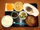 ごはん、味噌汁(豆腐、あげ、長ネギ)、チリ産の鮭の塩焼き、根菜のたまごとじ(キャベツ、人参、玉ネギ、たまご、三つ葉)、さつま芋の甘煮、キュウリぬか漬け、フルーツ:ネーブルオレンジ |
