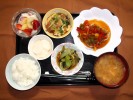 ごはん、味噌汁(白菜、しめじ、あげ、麻婆茄子(豚ひき肉)、がんもの含め煮(オクラ添え)、ほうれん草おかか和え、キュウリ梅しそ漬け、フルーツ:ネーブルオレンジ |