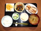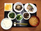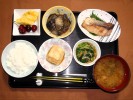 ごはん、味噌汁(白菜、しめじ)、ぶりの照り焼き(大葉)、茄子の炒め煮(白すり胡麻)、揚げ出し豆腐、ほうれん草なめ茸和え、フルーツ:台湾産生パイナップル、アメリカンチェリー |