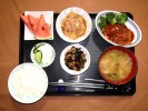 ごはん、味噌汁(茄子、あげ、みょうが)、中華ミートボール甘酢あん(水菜、サニーレタス、マヨネーズ)、厚揚げ煮、酢の物(もやし、キュウリ、カニカマ)、トマトわさび醤油和え(白すり胡麻、刻み海苔)、キュウリぬか漬け、フルーツ:愛媛産宇和ゴールド、アメリカンチェリー |