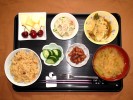 かしわ飯、味噌汁(大根、しめじ、かぶ葉)、新キャベツ・絹さやのたまごとじ、酢の物(もやし、キュウリ、カニカマ)、うずら豆煮、キュウリのぬか漬け、フルーツ:リンゴ、アメリカンチェリー |